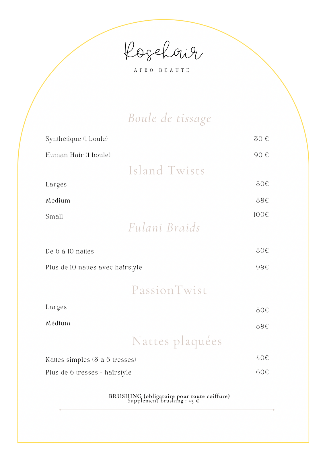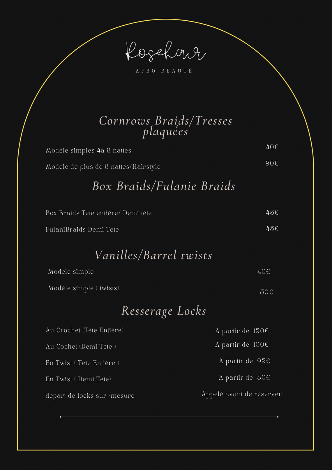 Chaque coiffure est réalisée avec soin, dans le respect de votre texture naturelle.Les tarifs peuvent varier selon la longueur, l’épaisseur et le niveau de détail.