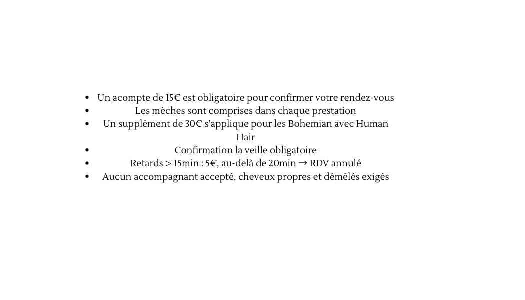 Merci de venir avec les cheveux propres et bien démêlés.Les durées indiquées sont estimatives et peuvent varier selon la longueur, la densité et la nature des cheveux de chaque personne.