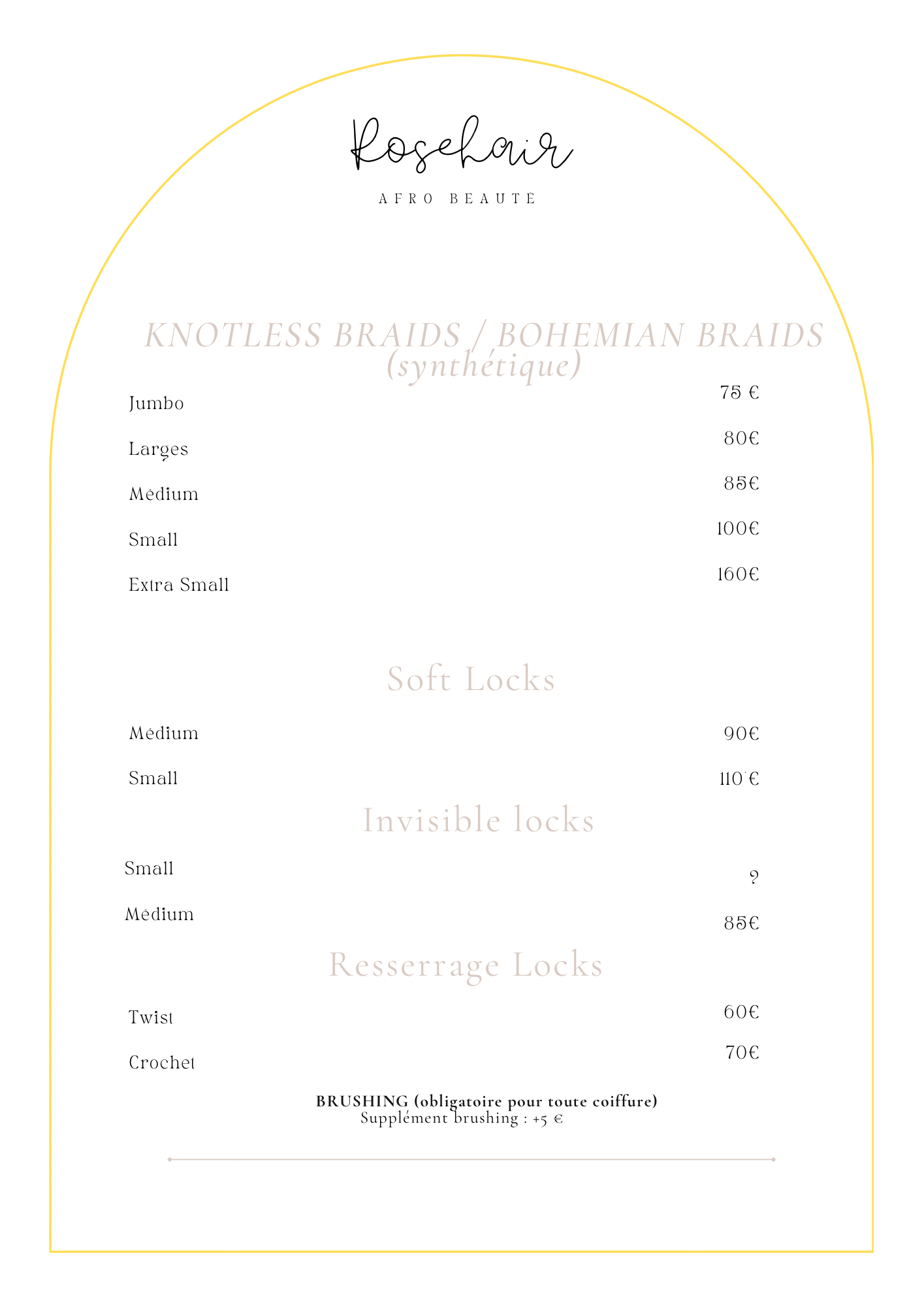 Chaque coiffure est réalisée avec soin, dans le respect de votre texture naturelle.Les tarifs peuvent varier selon la longueur, l’épaisseur et le niveau de détail.